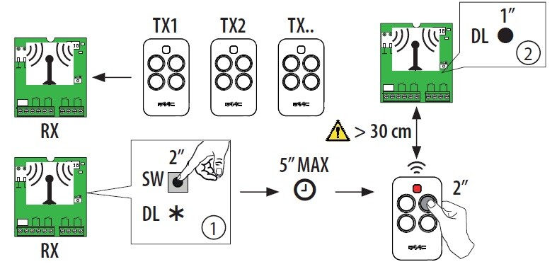 - Press and release the button to be memorised, check that it has been memorised on the receiver (RP/Decoder/Minidec: the LED lights up steadily for a couple of seconds. Other models: refer to the specific instructions)